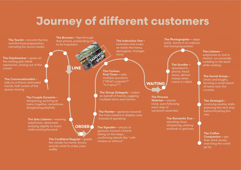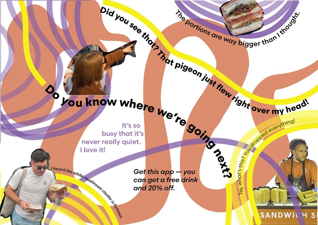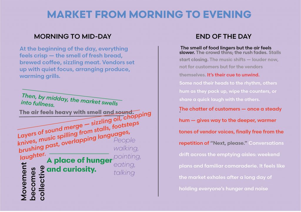 In Week 3 of my Borough Market critical observations, I created type inspired by objects and textures found in the surroundings, translating the market’s visual environment into letterforms. I took more notes of overheard conversations and dialogues that revealed the rhythm and tone of the space. By combining these overheard snippets with the type, I explored how language and environment intersect, capturing both the visual and social character of the market. I also continued to study the nuances of an order, how individuals and groups behaved, interacted, and formed subtle patterns within the lively public setting.